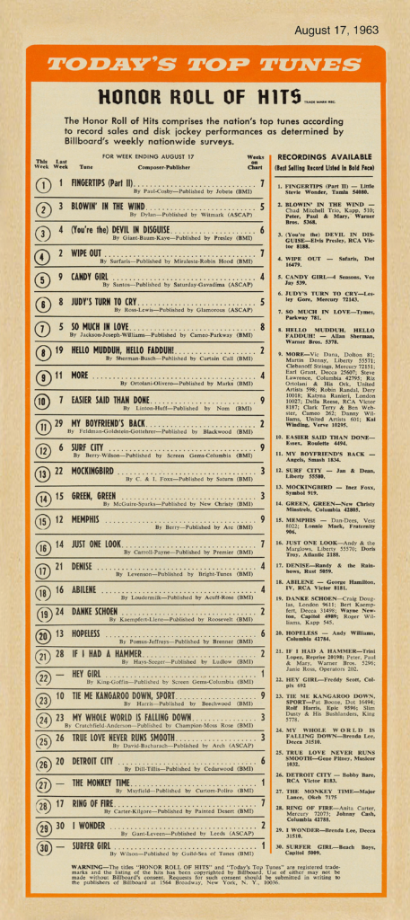 Next Image Billboard Honor Roll of Hits – August 17, 1963 (MCRFB 2020) BILLBOARD HONOR ROLL OF HITS (Week Ending) August 17, 1963